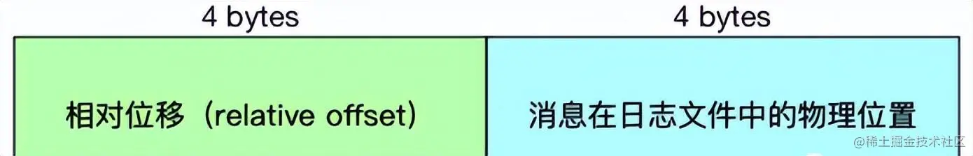 kafka日志的文件名一般都是该segment写入的第一条消息的起始位移值baseOffset,比如000000000123.log,这里面的123就是baseOffset,具体索引文件里面纪录的数据是相对于起始位移的相对位移值relativeOffset,baseOffset与relativeOffse的加和即为实际消息的索引值。假设一个索引文件为:00000000000000000100.index,那么起始位移值即 100,当存储位移为 150 的消息索引时,在索引文件中的相对位移则为 150 - 100 = 50,这么做的好处是使用 4 字节保存位移即可,可以节省非常多的磁盘空间。(ps:kafka真的是极致的压缩了数据存储的空间)