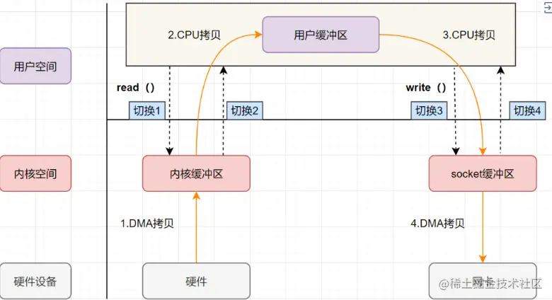 - DMA控制器把数据从socket缓冲区,拷贝到网卡设备,上下文从内核态切换回用户态(切换4) ,write函数返回