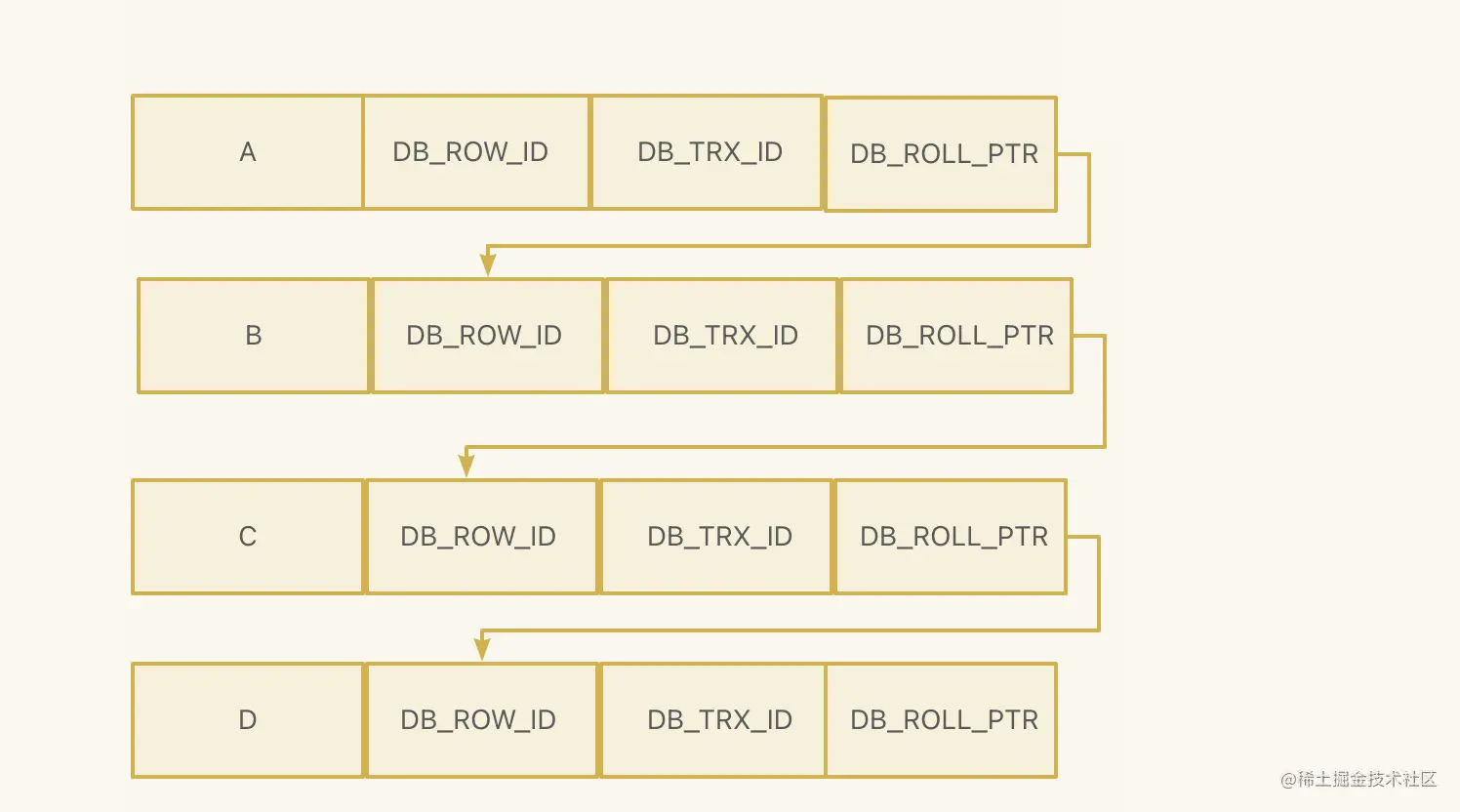 DB_ROLL_PTR: 占7个字节,该字段指向了上一个撤销日志(undo log),这样就现成了一个undo log的版本链;