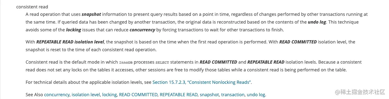 一致性视图(consistent read)大家可以看一下mysql官方的文档: