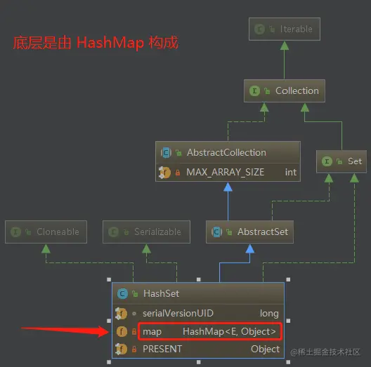 第一个定义一个 HashMap,作为实现 HashSet 的数据结构;第二个 PRESENT 对象,因为前面讲过 HashMap 是作为键值对 key-value 进行存储的,而 HashSet 不是键值对,那么选择 HashMap 作为实现,其原理就是存储在 HashSet 中的数据 作为 Map 的 key,而 Map 的value 统一为 PRESENT(下面介绍具体实现时会了解)。