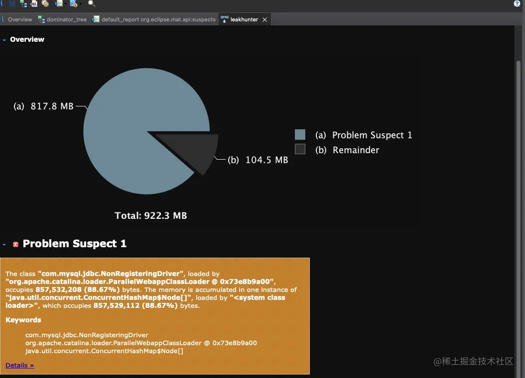 通过 MAT 工具分析发现,第一个可能的问题就是:com.mysql.jdbc.NonRegisteringDriver 占用比较大的内存,如下图: