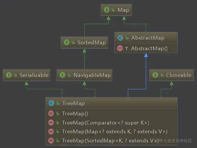 TreeMap 首先继承了 AbstractMap 抽象类,表示它具有散列表的性质,也就是由 key-value 组成。