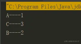 也就是说将 accessOrder = true,表示按照访问顺序来遍历,注意看上面的 第 5 行代码:map.get("B)。也就是说设置 accessOrder = true 之后,那么 B---2 应该是最后输出,我们看一下打印结果: