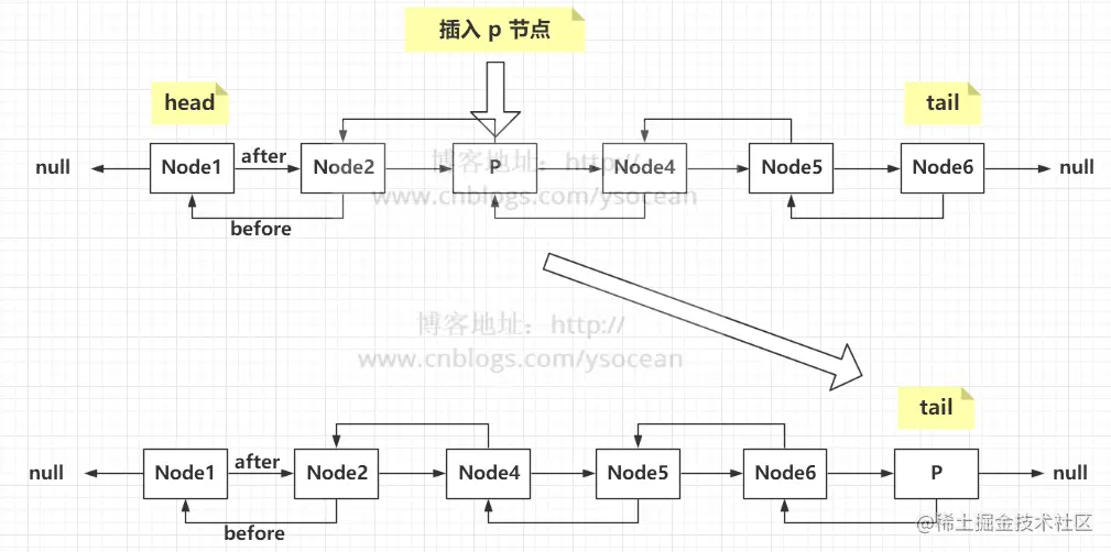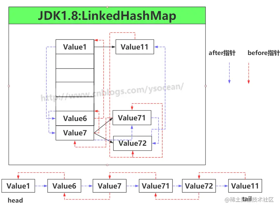 注意:这里有五个属性别搞混淆的,对于 Node next 属性,是用来维护整个集合中 Entry 的顺序。对于 Entry before,Entry after ,以及 Entry head,Entry tail,这四个属性都是用来维护保证集合顺序的链表,其中前两个before和after表示某个节点的上一个节点和下一个节点,这是一个双向链表。后两个属性 head 和 tail 分别表示这个链表的头节点和尾节点。