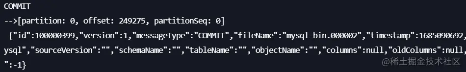 然后运行 ./subscribe --brokers=xxx --topic=xxx --group=xxx --trans2sql=true。这里的 Brokers、Topic、Group 分别填入 CKafka 的地址、消费 Topic 名称、消费组名称。