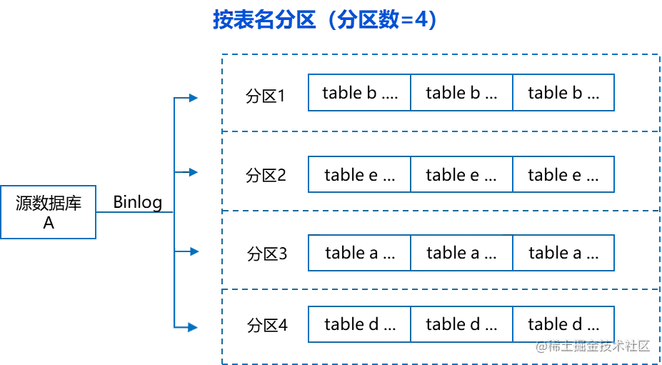 在选择按表名分区的场景中,源库同一个表的数据变更都会投递到目标 Topic 下的同一个分区中,因为日志的解析是按序排列,所以投递到 Topic 分区中的消息也是按序排列。