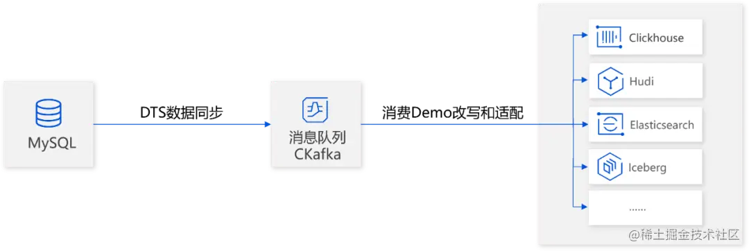 数据源头为 MySQL,通过 DTS 获取 MySQL 的全量+增量数据到消息队列 CKafka,然后适配消费 Demo,将消息投递到数据湖仓。