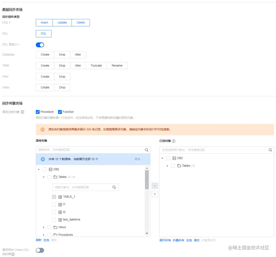 对于库表结构的变更,一键勾选 DDL,即可在后续自动同步库表结构的变更数据。