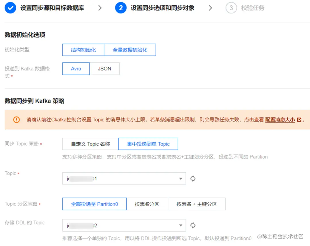 这个步骤主要是选择同步的数据格式(Avro、JSON)、数据投递到 CKafka 的哪个 Topic 下、分区策略等。