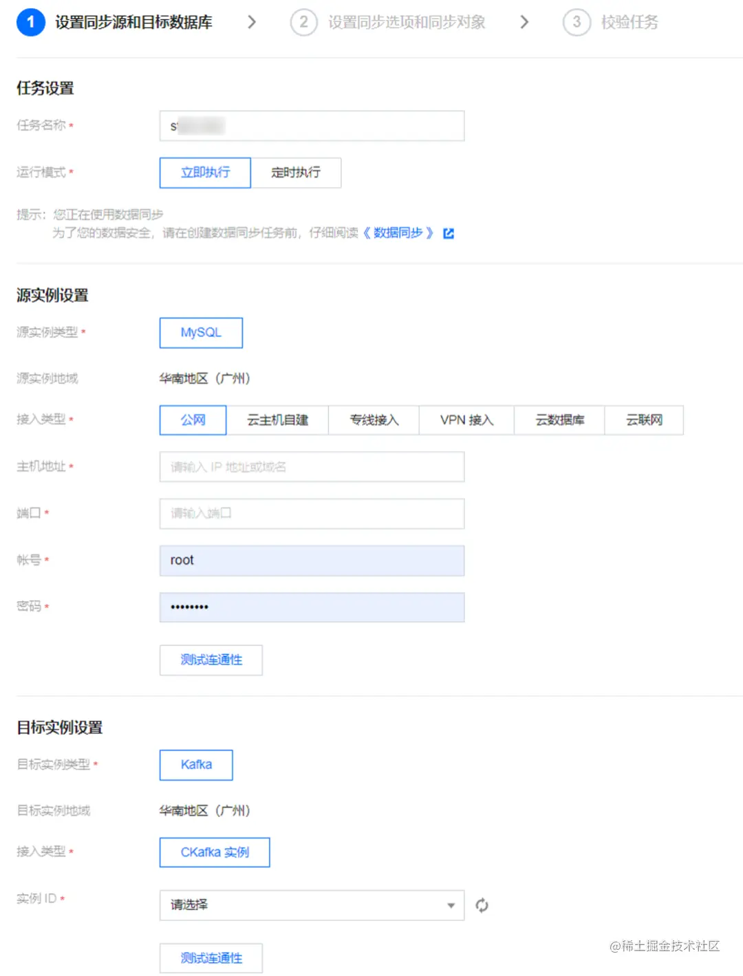 配置 DTS 连接源库和目标库,源库配置中填入 MySQL 的主机地址/端口/用户名/密码,目标库选择 CKafka 实例 ID。