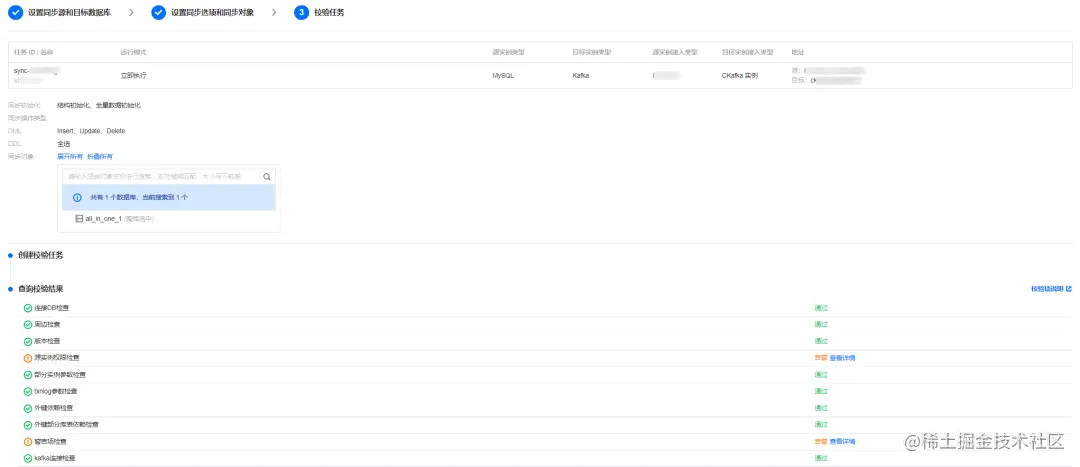 这个步骤主要是验证 DTS 到源和目标库的网络是否打通,对应的用户权限是否满足要求,如果源库有安全组设置需要允许 DTS IP访问,否则网络不通。