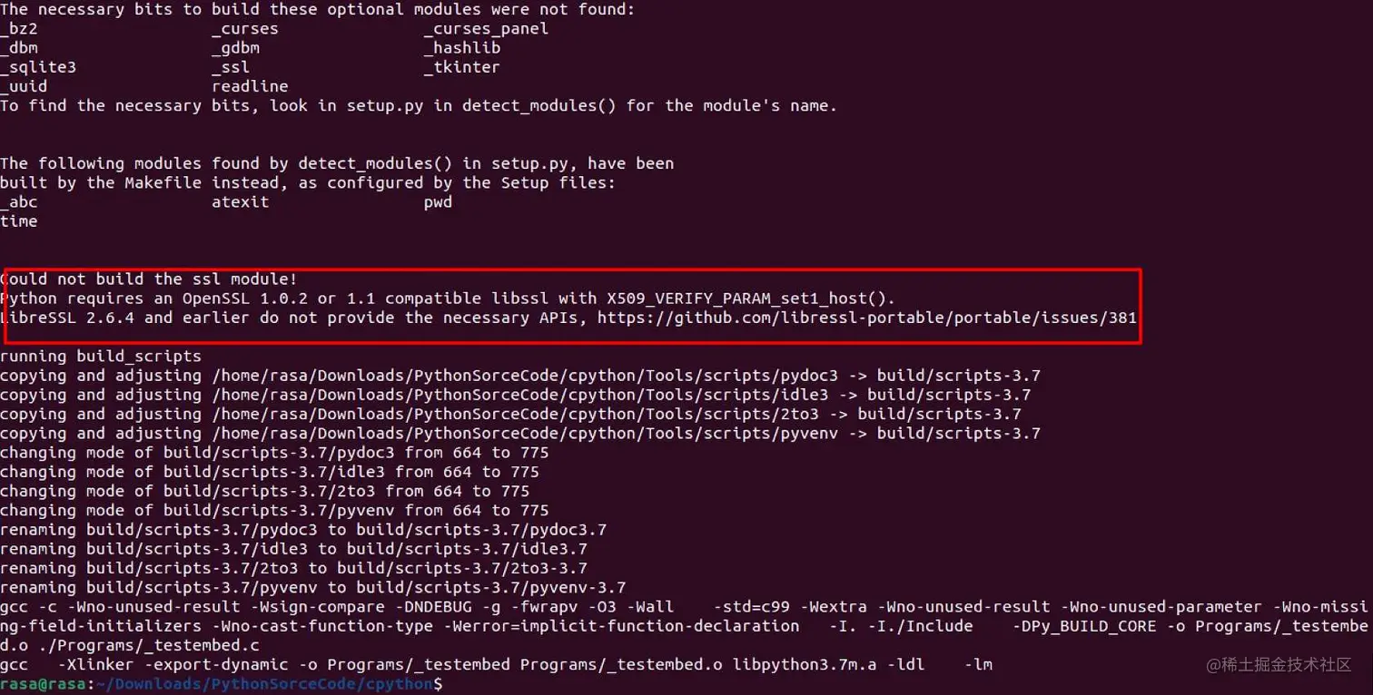 make命令后报错如下所示:因为openssl 1.0.1存在安全问题,所以Python3.7以上建议使用libressl代替openssl,故需通过源码编译安装libressl,如下所示: