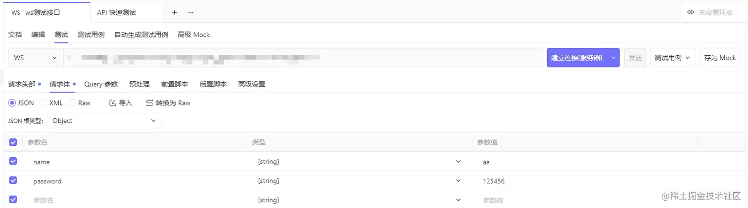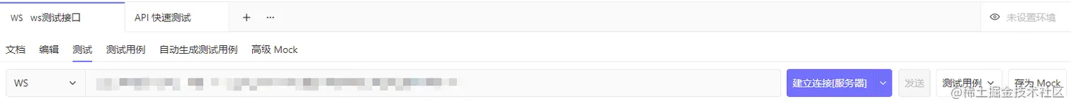 进入某个WS协议的API文档详情页,点击文档上方 测试 标签,即可进入 API 测试页,系统会根据API文档的定义的求头部、Query参数、请求体自动生成测试界面并且填充测试数据。