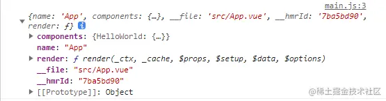Component本质上是一个对象,在Vue项目中我们虽然使用的是单文件的.vue文件来构建一个组件,但经过vue-loader的解析之后得到的其实就是一个对象,通过打印main.ts中引入的App.vue我们可以得到以下结果,可以很明显的看出Component本质就是一个对象。