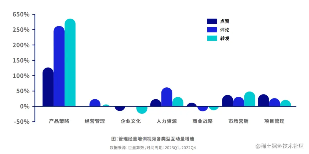 用户的互动性整体增加,主要由产品策略培训的视频带动,其点赞、评论和转发量的增速均优于其他品类。用户的主动搜索行为快速上升,搜索次数增速接近20%。主要搜索市场营销、人力资源和经营管理相关内容。 其中经营管理相关内容的搜索次数增速超过80%。