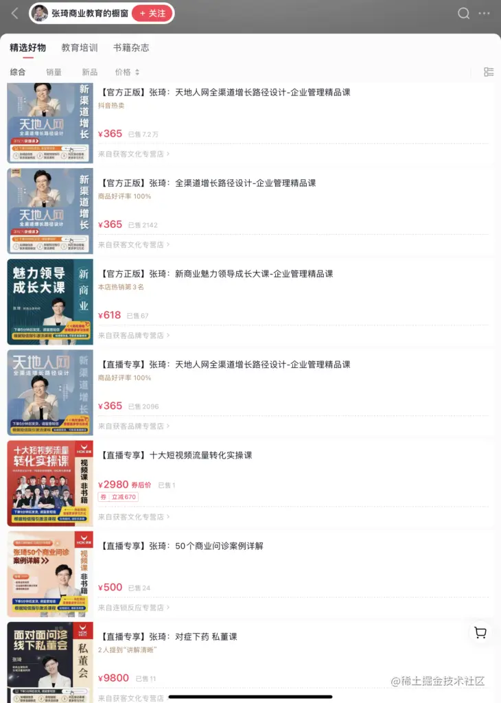 单单是这份在抖音商品橱窗定价为365元的最低价课程,截至目前为止,张琦一共卖出了7.2万份,总计收入约两千六百万元。与此同时,张琦的课程商品分梯级价格销售,从365元、500元、618元、2980元到9800元的私董课程,展现出从低价课程——高价课程——私人咨询的转换。