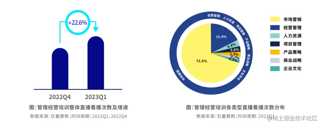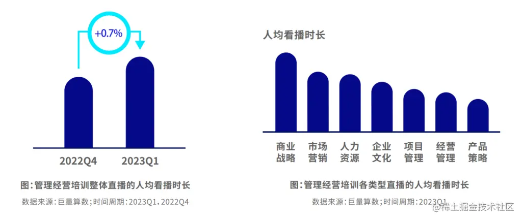 ② 除了短视频,用户观看直播次数也在高速增长,增速超过20%。经营管理的看播次数占比高于短视频播放量占比,超过15%,用户更喜欢通过直播学习经营管理。用户的人均看播时长增速稳定,商业战略的直播消费深度较高,人均看播时长明显高于其他品类。