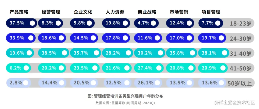 中年群体通过管理经营培训加强职场上的竞争力,越来越多18-23岁的年轻群体对产品策略培训内容感兴 趣,银发群体更加偏好商业战略的内容。