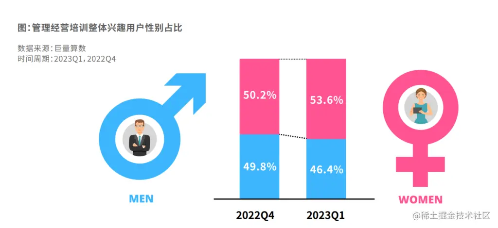 在报告中,我们可以看到女性用户占比进一步增加,其兴趣主要表现在企业文化、人力资源和市场营销培训方面;而男性群体对产品、战略、项目和经营管理更加感兴趣。