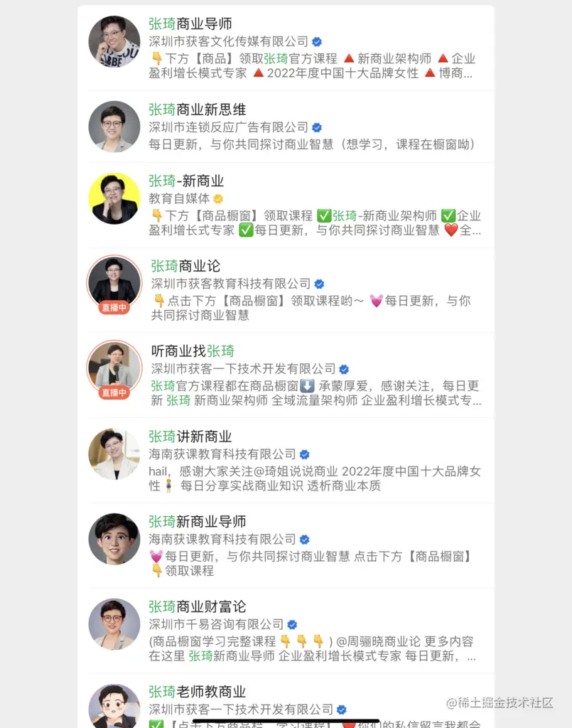 | 风格: 强烈的自信、精英性质的人设,表达接地气,通俗易懂;语言节奏好,金句密集;表情带手势,气场全开 | 视频分类: 正能量、认知、创新、商机、人生感悟、商业解答矩阵: 视频内容也极为相似,在抖音橱窗都挂上了售课链接 | 课程目标受众清晰:下沉市场,传统中小企业的老板( 群体基数比较大;疫情下该人群处于焦虑求变的心理 )“ 张琦:我非常了解创业者的需求、心理,也非常清楚他们想要什么。 ” |
