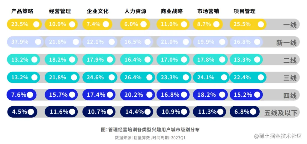 从城市发达程度来看,对管理经营类最感兴趣的用户主要集中在三线城市。相较而言,高线级城市用户更加偏好产品策略和项目管理,低线级城市对于人力资源培训更加感兴趣。