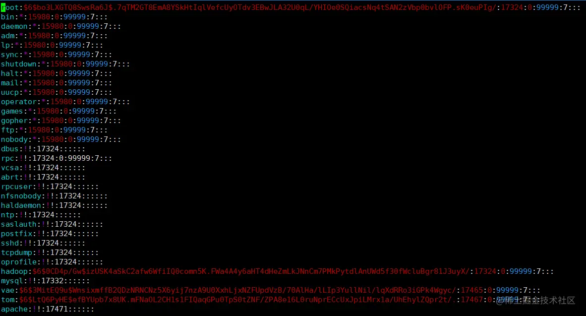同理上面的每一行和 passwd 文件一样,都是表示一个用户。passwd描述的是用户信息,shadow文件描述的是用户密码。我们还是以第一行为例: