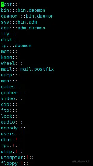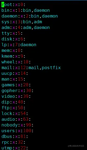 一般创建一个用户,立即创建一个和用户名相同的用户组,我们还是以第一行 root 为例: