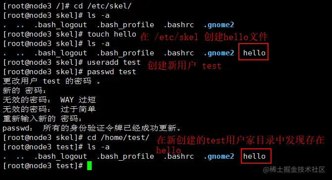 范例:我们在 /etc/skel 目录下创建一个 hello 文件,然后创建一个新用户 test,进入到 test 用户的家目录/home/test 就会看到有 hello 文件。