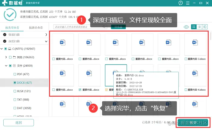 4.第二次扫描为深度扫描,通常需要花费较长时间,但扫描结果较全面,等到深度扫描结束后,再一次对所有需要恢复的文件进行选择,选择完毕后,点击【恢复】,并为恢复后的文件选择恰当的存储位置。