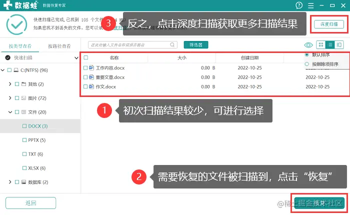 3.第一次扫描为快速扫描,通常时间较快,但扫描结果呈现较少,我们可以先对扫描结果进行筛选,如果需要恢复的文件初次扫描就扫描到了,直接点击 【恢复】 ,反之,点击 【深度扫描】 ;