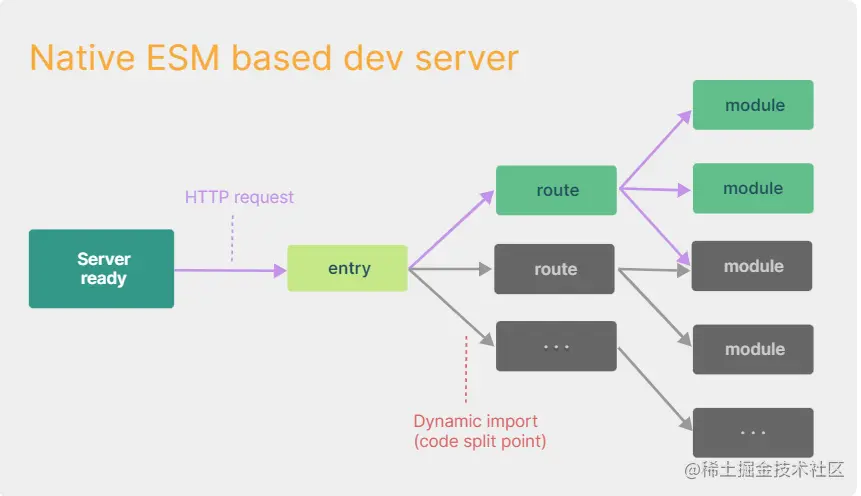 然后是vite的工作模式:构建的比较快,动态打包