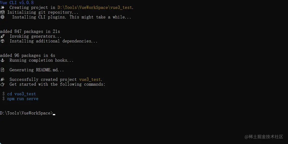 出现以下界面表示成功了。并且提供给我们两个命令:进入项目,启动项目
