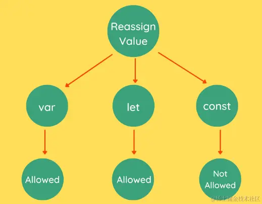 这是一个思维导图,可帮助您了解重新分配对使用这三个关键字声明的变量的工作原理。