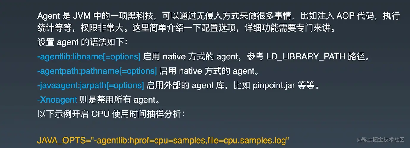 Agent 是 JVM 中的一项黑科技,可以通过无侵入方式来做很多事情,比如注入AOP 代码,执行统计等等,权限非常大。这里简单介绍一下配置选项,详细功能需要专门来讲。