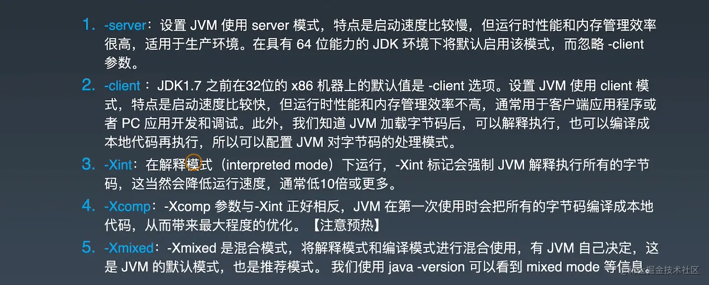 在解释模式(interpreted mode)下,-Xint 标记会强制 JVM 解释执行所有的字节码,这当然会降低运行速度,通常低 10 倍或更多。