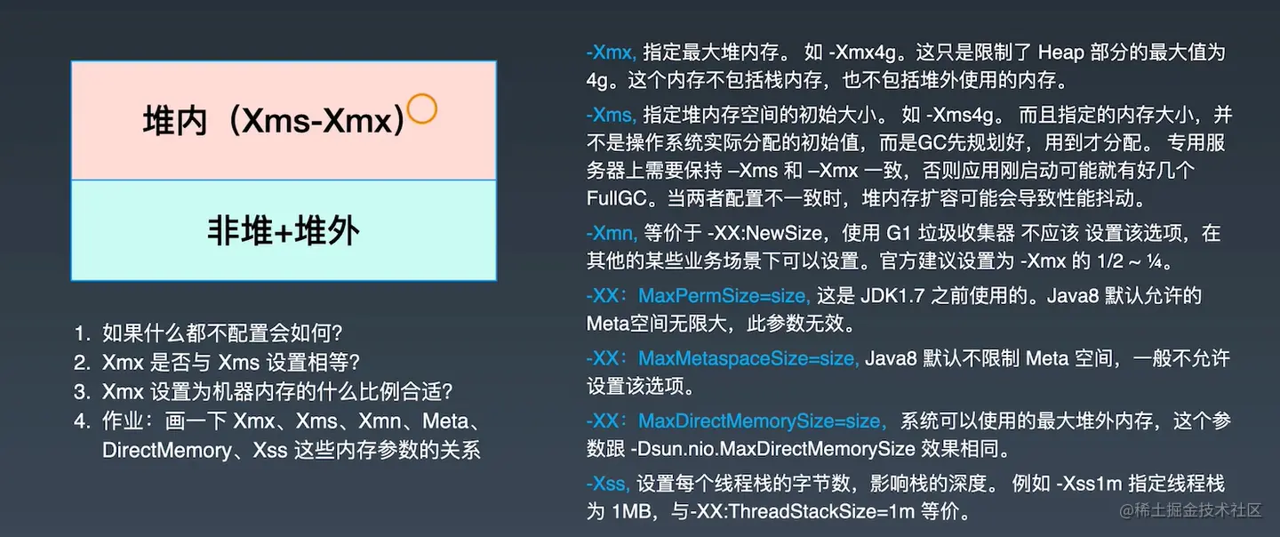 系统有大量的地方使用堆外内存,远比我们常说的 xmx 和 xms 包括的范围要广。所以我们需要在设置内存的时候留有余地,一般来说配置系统或容器里可用内存的 70-80% 最好。