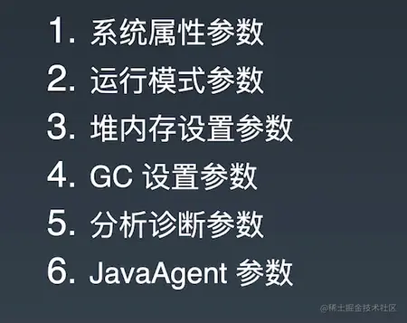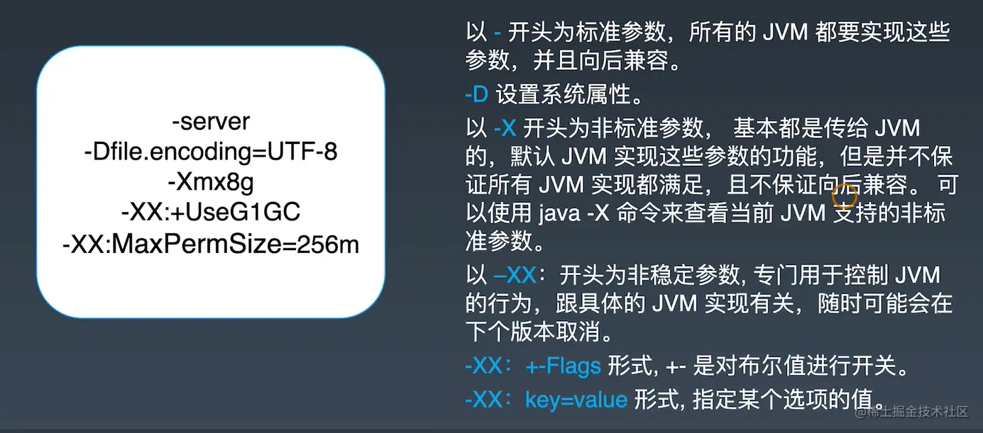 - 以 - 开头为标准参数,所有的 JVM 都要实现这些参数,并且向后兼容,如 -server。 2. -D 设置系统属性,如 -Dfile.encoding=UTF-8。 3. 以 -X 开头为非标准参数,基本都是传给 JVM 的,默认 JVM 实现这些参数的功能,但是并不保证所有 JVM 实现都满足,且不保证向后兼容。 可以使用 java -X 命令来查看当前 JVM 支持的非标准参数,如 -Xmx8g。 4. 以 –XX:开头为非稳定参数, 专门用于控制 JVM 的行为,跟具体的 JVM 实现有关,随时可能会在下个版本取消。 -XX:±Flags 形式, ± 是对布尔值进行开关,如 -XX:+UseG1GC。 -XX:key=value 形式, 指定某个选项的值,如 -XX:MaxPermSize=256m。