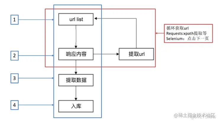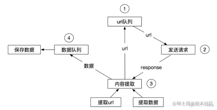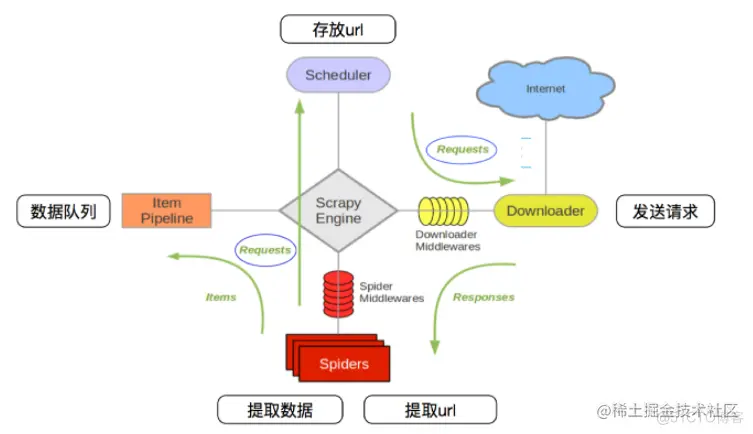 - 爬虫提取url地址,组装成request对象---->爬虫中间件--->引擎--->调度器