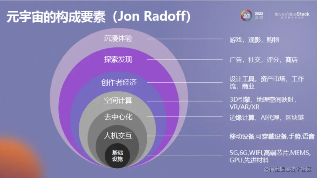这张图是Jon Radoff提出的元宇宙构成要素。底层是基础设施,接下来是人机交互,包括交互体验和方式等;再往上是去中心化,如边缘计算、AI代理、区块链等,其相当于元宇宙的机制;空间计算即如何把元宇宙中的虚拟空间和现实进行映射结合,以获得沉浸感体验;传作者经济和探索发现关乎元宇宙具体如何运作;最上层是在综合了视觉、听觉、触觉等之后,给用户带来最终的沉浸体验。