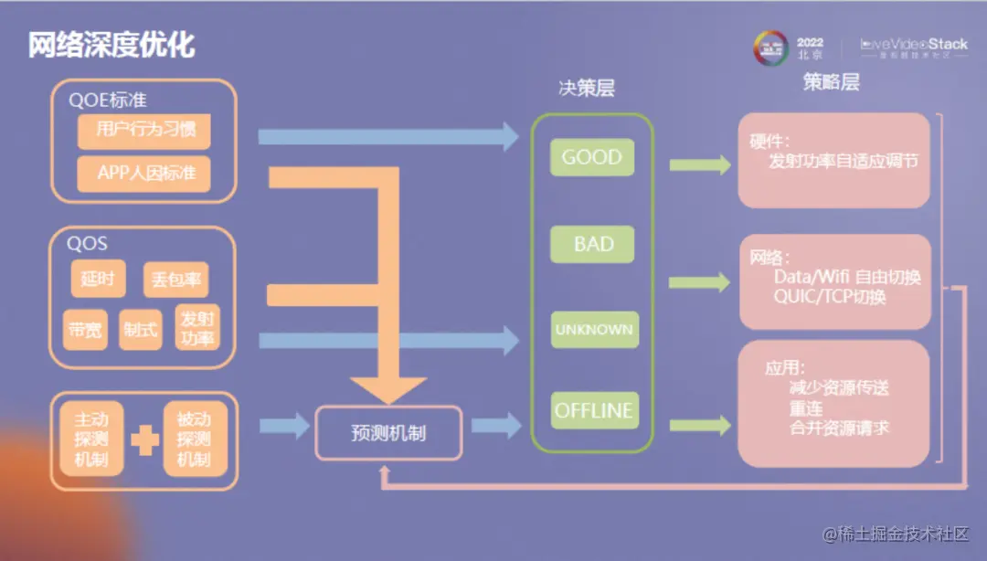 首先是网络深度优化。在预测机制方面,根据QoE和QoS映射关系,进行主动和被动探测,通过决策层然后做出相应的策略。