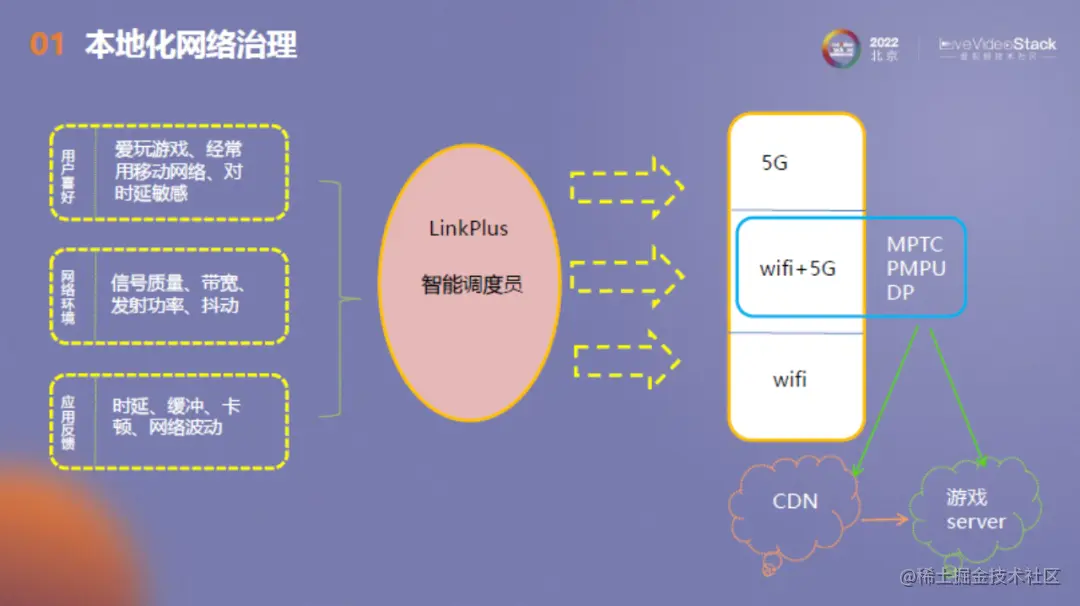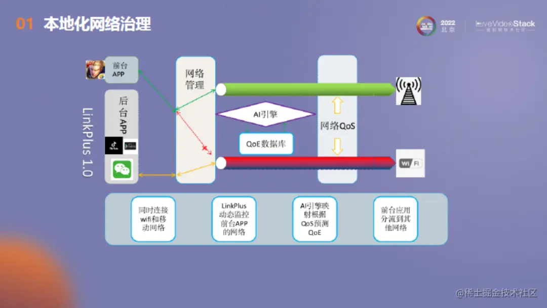 前端有三个感知模块,分别是用户喜好、网络环境和应用反馈的感知。接着,把对应的感知结果传到LinkPlus智能调度,以分配不同的网络。