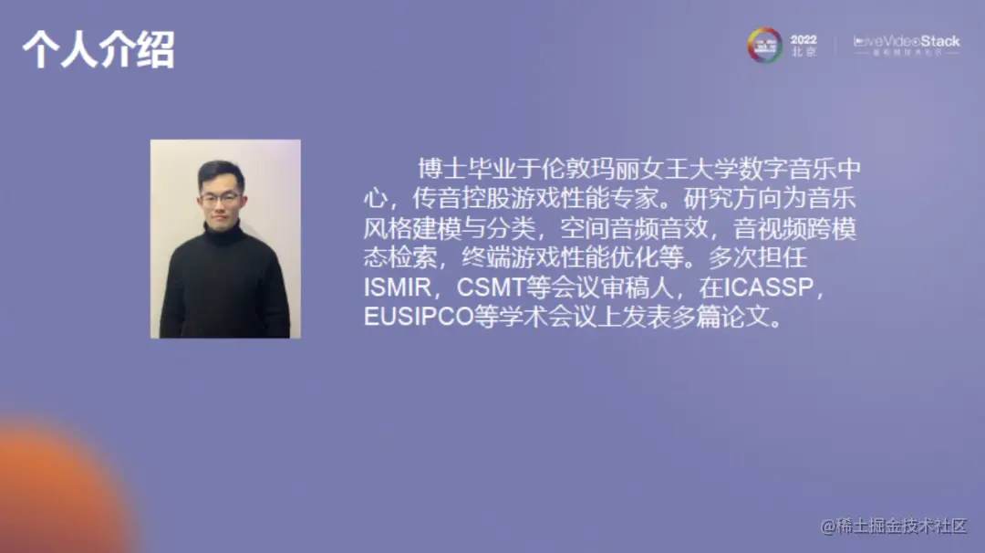 接下来做个自我介绍,我叫赵玉东,博士毕业于伦敦玛丽女王大学,研究方向主要是音频相关,包括音乐风格建模等。在传音,我主要负责游戏端音频探索、性能优化等。