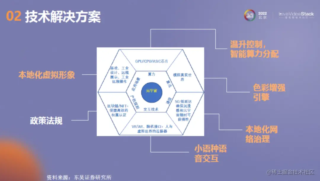 上图是元宇宙相关技术的分类,包括应用场景、算力、算法、通信、交互技术、产权规则。对应的,每一类别都面临相应的挑战,比如算力会有性能瓶颈,算法模拟的真实世界需要考虑人文文化,在通信层面需要应对不同国家地区的网络情况等等。