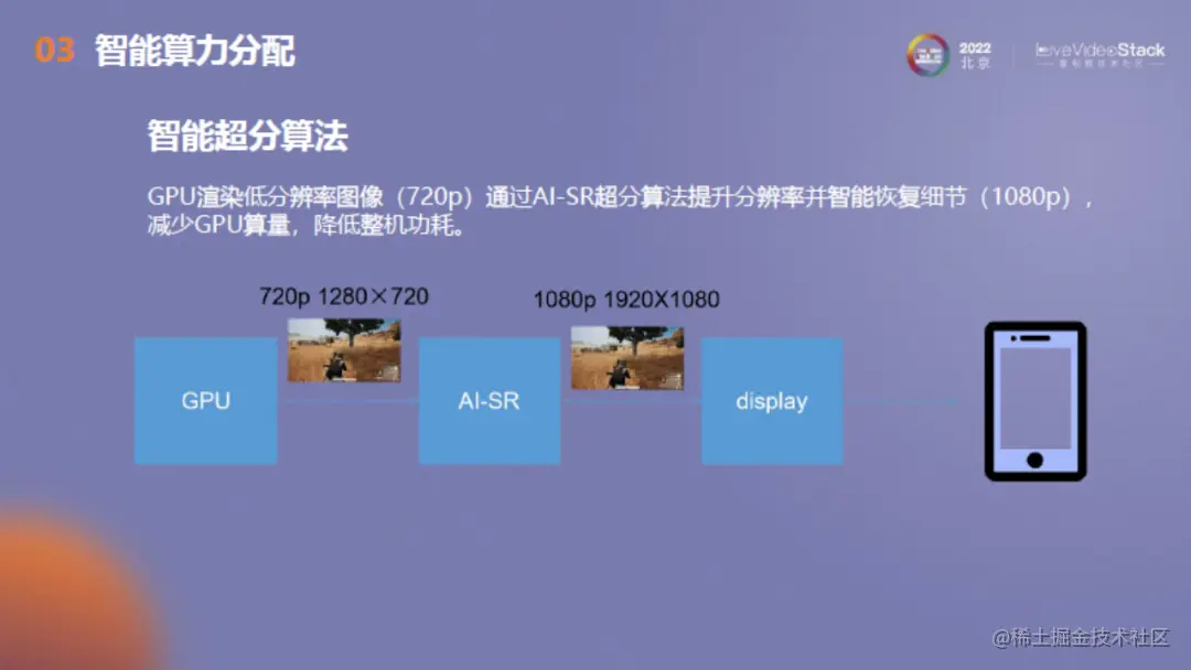 首先是智能超分算法。GPU渲染低分辨率图像(720p),通过AI-SR超分算法提升其分辨率并智能恢复细节(1080p),以减少GPU算量,降低整理功耗。