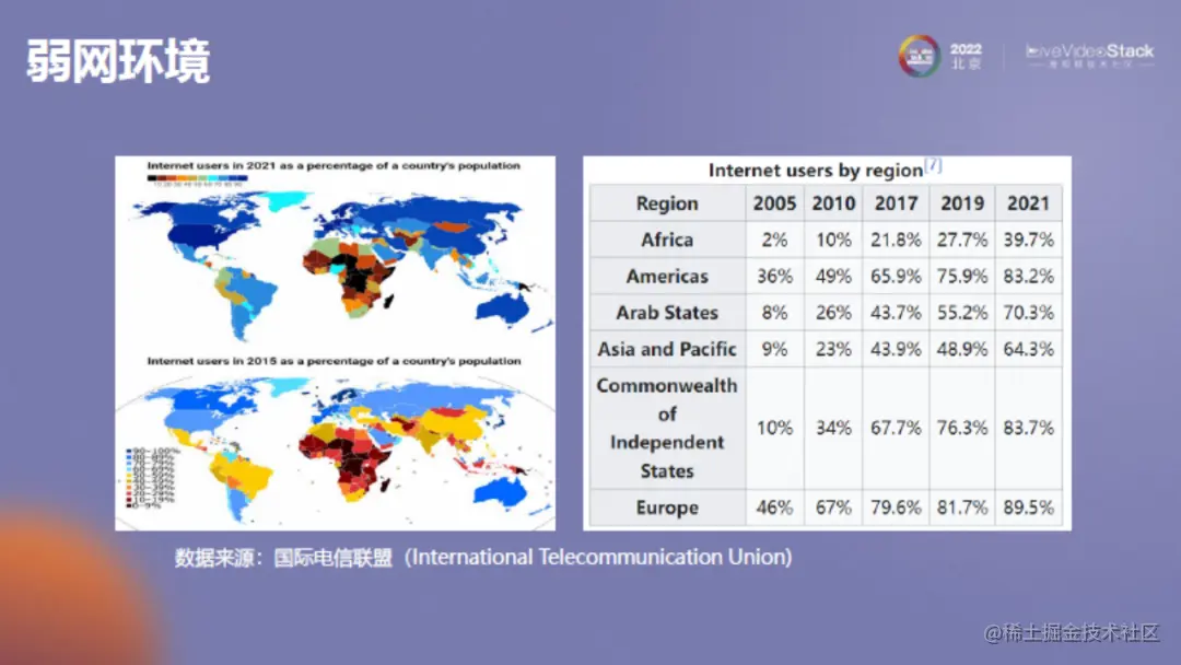 上图是各国互联网用户在本国家的数量占比情况。可以看到,从2005年到2021年,各国的互联网用户有明显的增长,但例如非洲等地的入网人数还是比较有限的,这也一定程度反映了各国网络基础设施是参差不齐的,同时也会给用户服务带来一些问题和挑战。