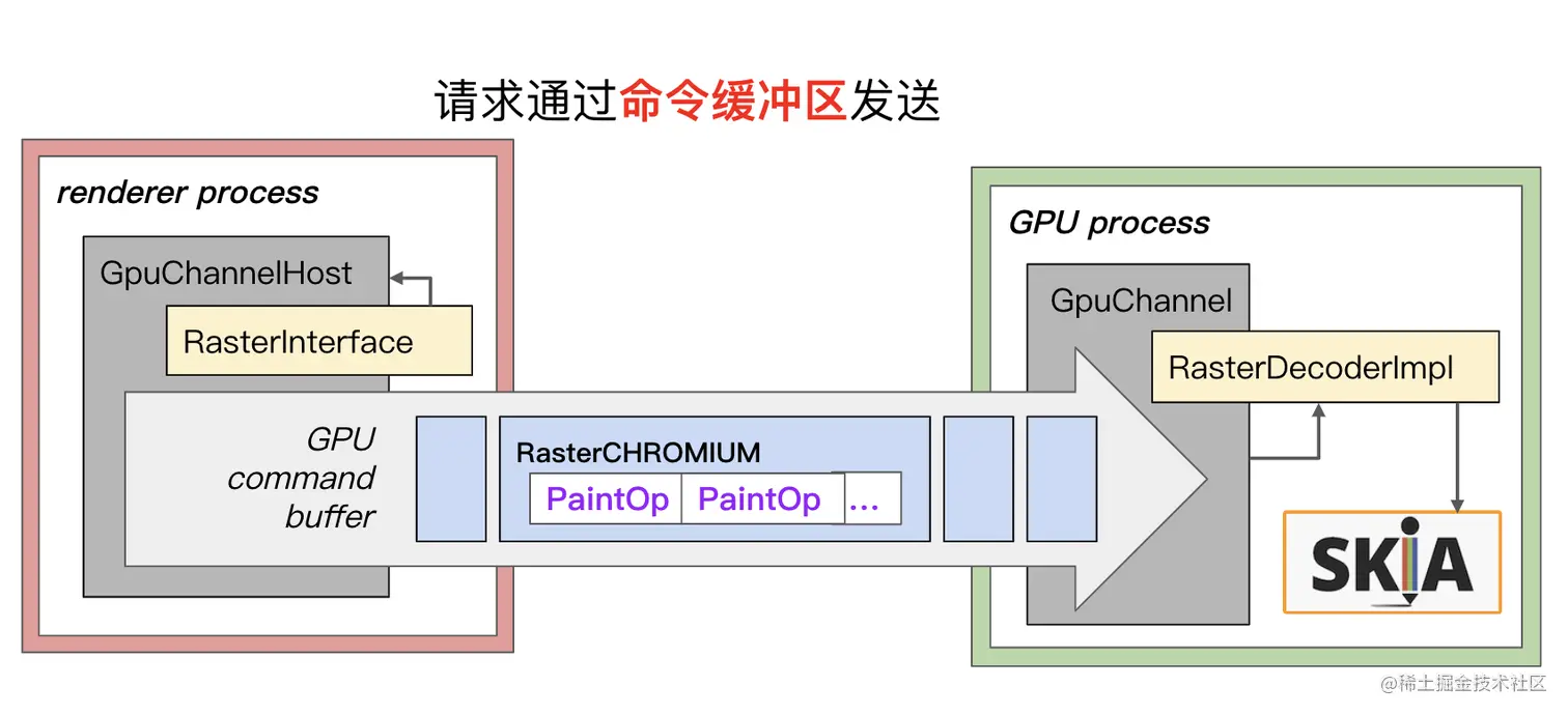 这些GL调用在viz合成线程上,它们通过命令缓冲区进行序列化和代理,发送到GPU主线程,在那里解码器会发出真正的GL调用。