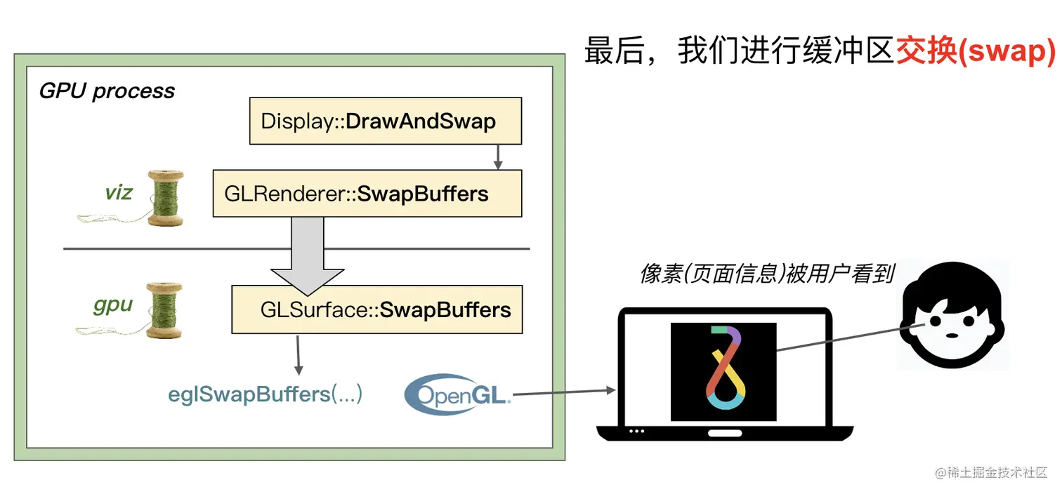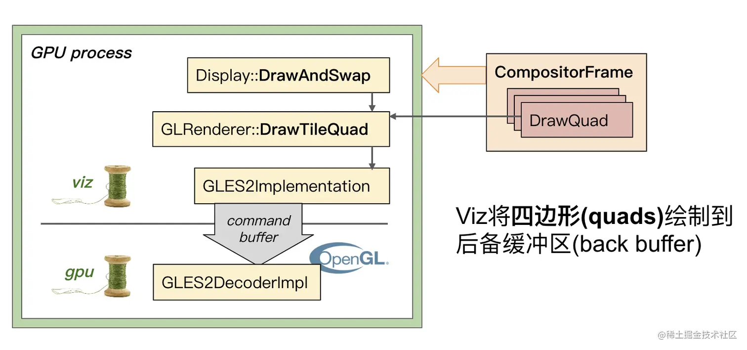 Viz还会发出GL调用来显示{合成帧|Compositor Frame}中的每个四边形。