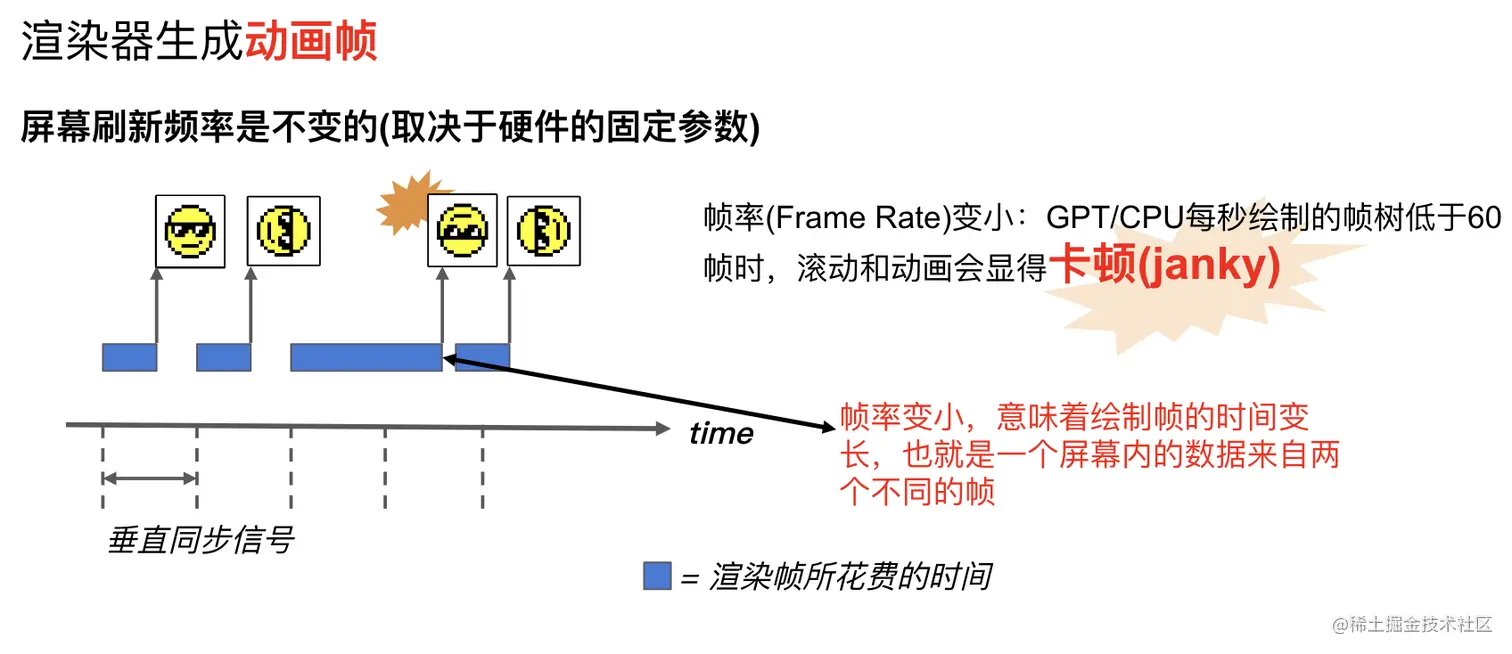 - 帧率是动态变化的,例如当画面静止时,GPU 是没有绘制操作的,屏幕刷新的还是buffer中的数据,即GPU最后操作的帧数据。