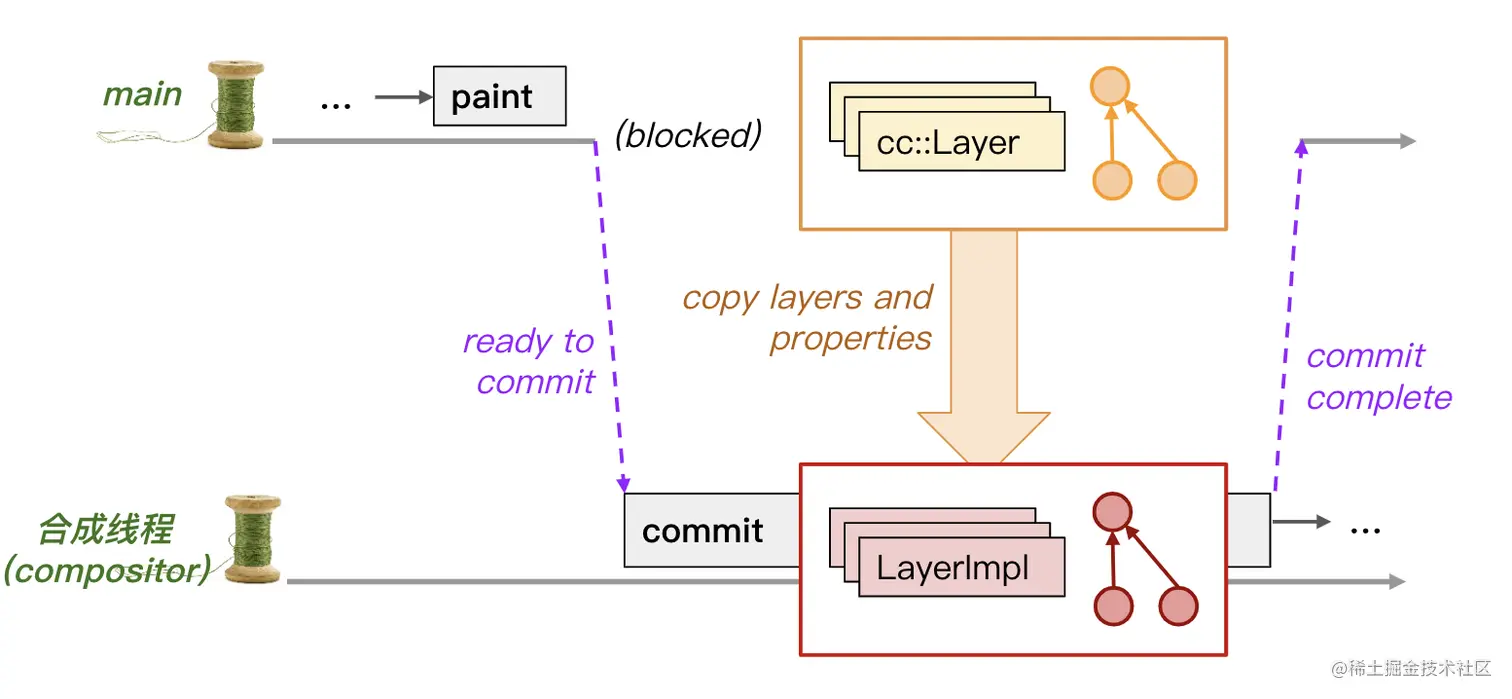 在绘制完成后,提交(Commit)操作会在合成线程上更新图层列表和属性树的副本,以使其与主线程上的数据结构状态保持一致。